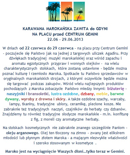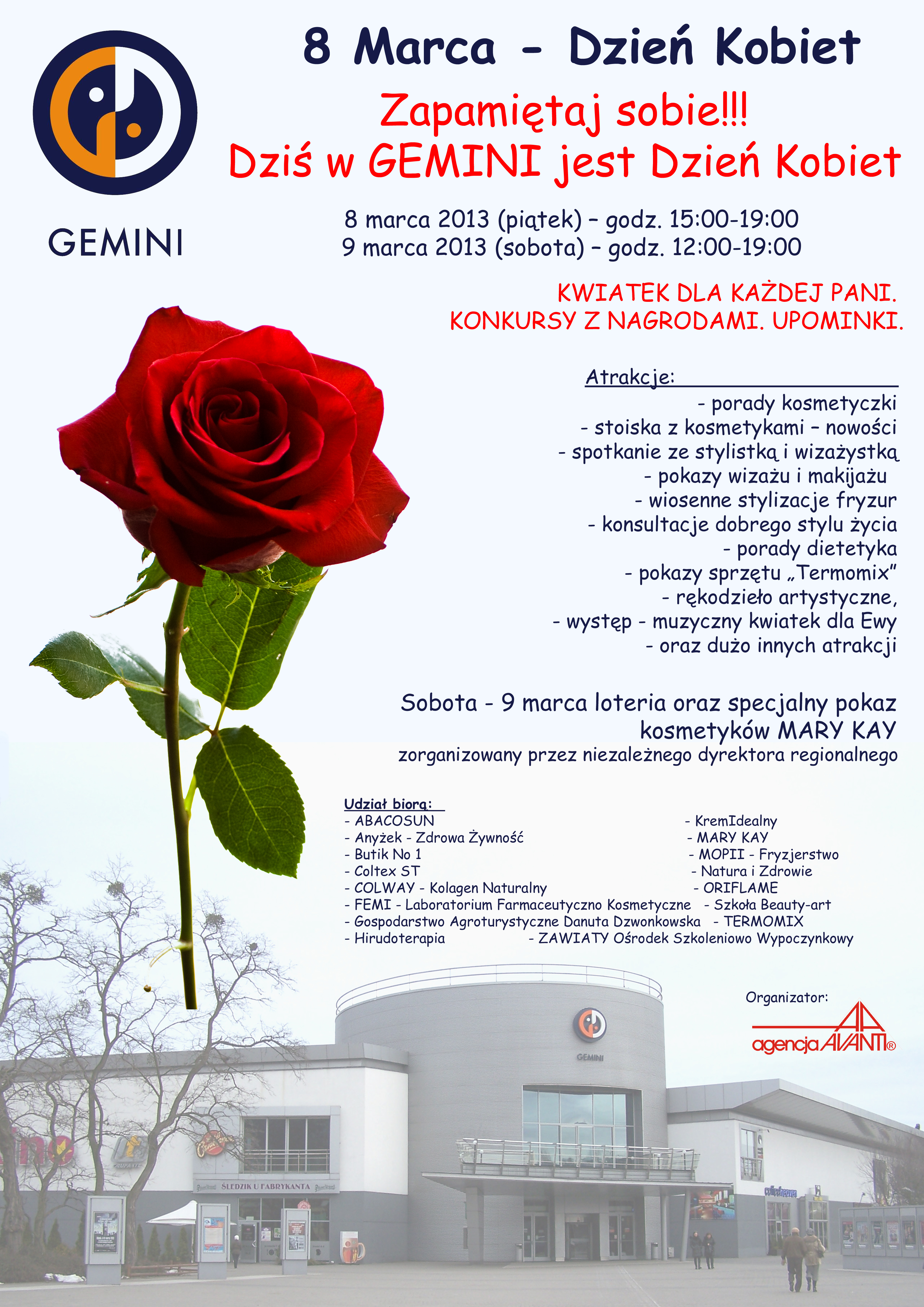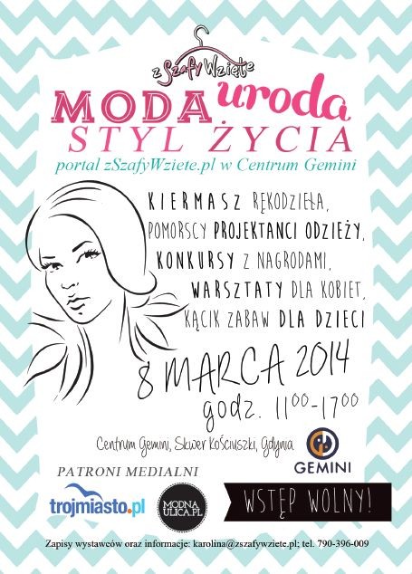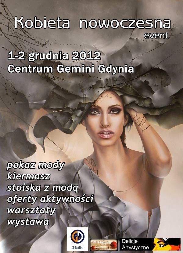 W pierwszego weekend grudnia (1-2 grudnia 2012) w Centrum Kultury i Rozrywki Gemini w Gdyni w godzinach 12.00-18.00, odbędzie się niezwykłe, dedykowane wszystkim kobietom wydarzenie: event Kobieta Nowoczesna. Na całość imprezy złożą się takie wydarzenia jak: Kiermasz Rękodzieła Delicje Artystyczne, pokaz mody, na którym zobaczyć będzie można kolekcję Katarzyny Ambroziak Atelier Ambris i biżuterię kwiatową Katarzyny Tkaczewskiej Zielone Studio, warsztaty wytwarzania biżuterii i patchworku, Strefa Aktywności, w ramach której zostaną zaprezentowane pokazy tańca i jogi, a także wernisaż wystawy fantastycznych prac Łukasza Jarugi, portretującego w niezwykły surrealistyczny sposób kobiety.