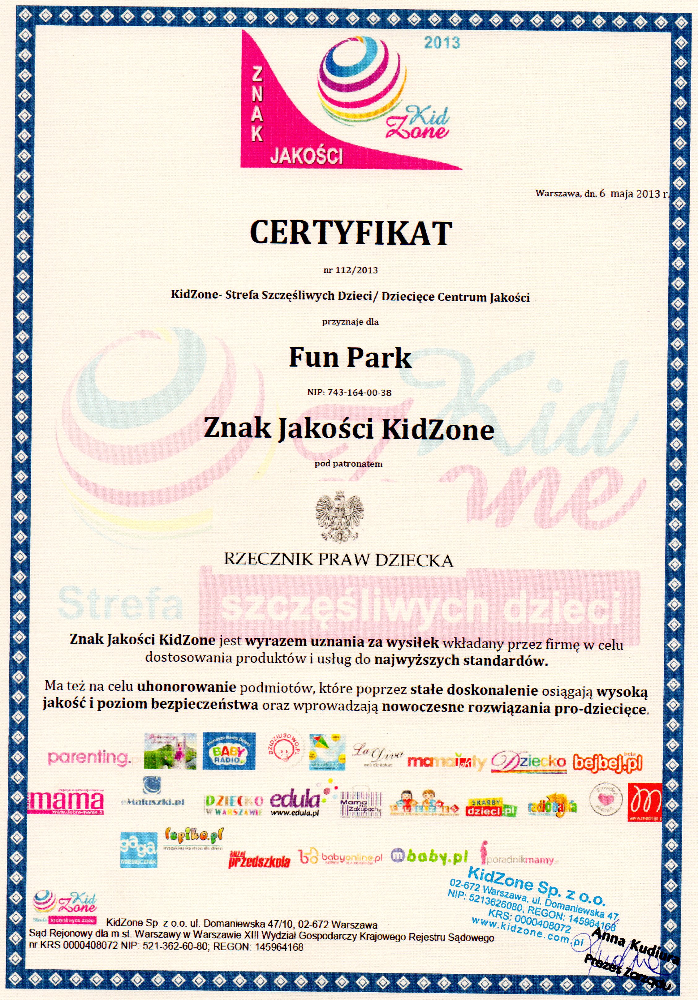 Znak Jakości KidZone - Strefa Szczęśliwych Dzieci - Edycja 2013r. pod honorowym patronatem Rzecznika Praw Dziecka. Znak Jakości KidZone jest wyrazem uznania za wysiłek wkładany przez firmę w celu dostosowania produktów i usług do najwyższych standardów. Ma też na celu wyłonienie i uhonorowanie podmiotów, które w codziennych działaniach dążą do osiągania najwyższej jakości i wysokiego poziomu bezpieczeństwa swoich produktów i usług. więcej...