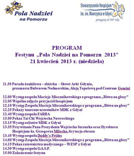 21 kwietnia - w niedzielę - po raz kolejny w Gemini - odbędzie się kolejna edycja akcji charytatywnej POLA NADZIEI. Zapraszamy wszystkich, którzy zechcą wesprzeć Hospicjum im Św. Wawrzyńca w Gdyni - podczas festynu rodzinnego - który odbędzie się na placu przed Centrum Gemini w godzinach od 12.00 do 15.00. W programie wiele atrakcji, m.in. koncerty, licytacje, pokaz Tai Chi, pokaz ratownictwa medycznego, występy dzieci z gdyńskiego MDK.