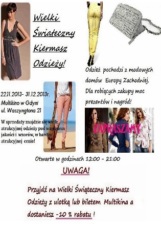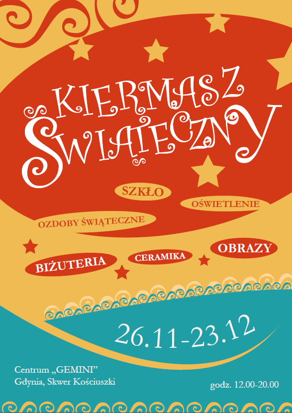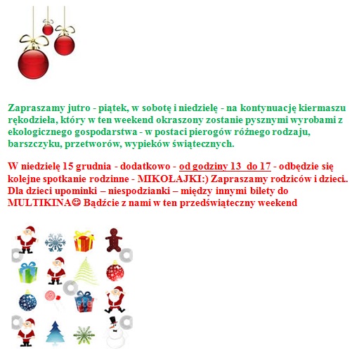 Na sobotę 1 grudnia przewidziany jest Kiermasz Rękodzieła Delicje Artystyczne, (w godzinach 12.00-18.00), na którym każda kobieta znajdzie coś niezwykłego, niepowtarzalnego, wytwarzanego ręcznie, z pasją: biżuterię, ozdoby z filcu, decoupage, patchwork, maskotki dla dzieci, a także takie rarytasy jak: ręcznie malowane koszulki, artystyczne stroje. Dodatkową atrakcję kiermaszu jest fakt, że z twórcą każdego dziełka będzie można porozmawiać osobiście, spytać o inspiracje. W trakcie kiermaszu chętne osoby będą mogły dać się sportretować przez pracownię rysunku M&W.